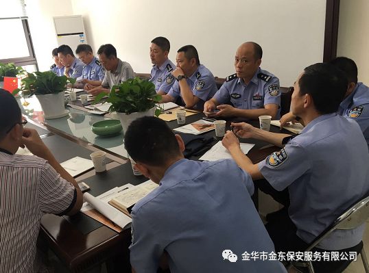 金华市公安局领导一行参观了金华市金东保安公司新搬迁的办公大楼,现场考察了金东保安公司的实际运营情况,并且与公司相关负责人在公司会议室举行了座谈会,对于金东保安公司取得的成绩予以肯定,就金华市区大型群众性活动安全监管工作以及金华市保安协会关于建立大型群众性活动安保专业队伍的情况,进行了工作指导和深入沟通。金华市公安局经文保支队副支队长楼荣锦就关于市本级大型安保活动的情况发表了讲话,与会的领导们在规章制度、管理团队、安保经验、设施设备等八个方面进行了详细询问和资料查阅,并且就公司的整体实力进行了评估。